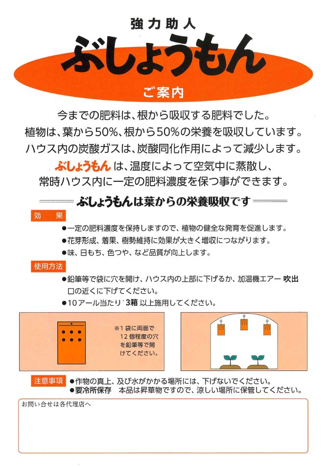 ハウス専用炭酸同化作用促進剤「ぶしょうもん」|品揃えと低価格!農業資材・農業用品専門通販のインターネットホームセンター「日本農業システム」