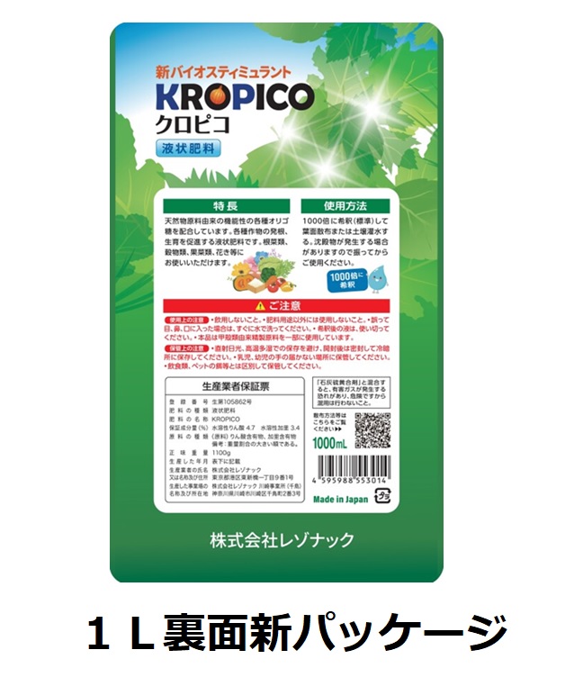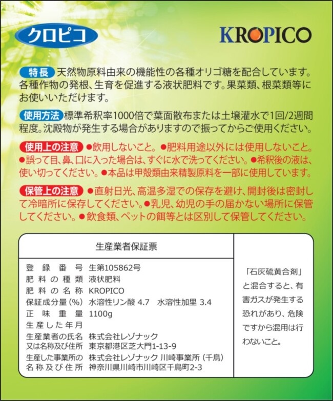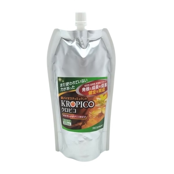 クロピコは天然物由来原料から造った数種類の機能性オリゴ糖が主成分の液状肥料(バイオスティミュラント/BS)です。 化学合成物質は一切配合していません。生物にも環境にも優しいサステナブルな商品です。