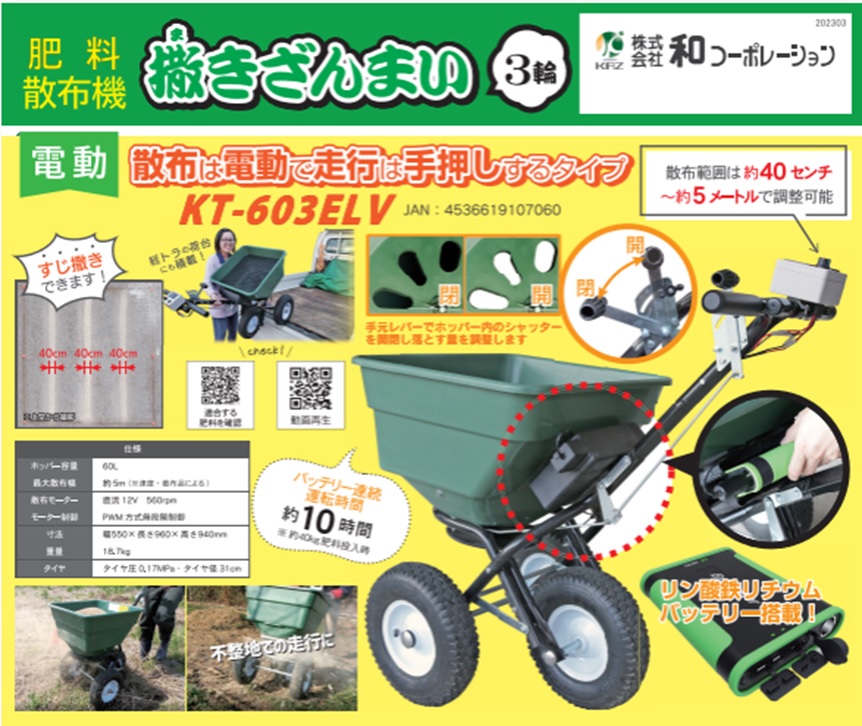 散布範囲(粒状肥料の場合):最大4.5~5.0m