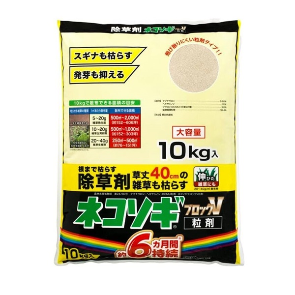 約6か月効果持続(20g/㎡散布時)の、粒状除草剤。雑草が生える前から使え、草丈40㎝の雑草も枯らす(20~40g/㎡散布時)。