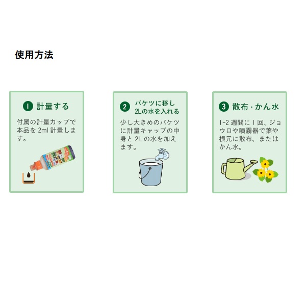 ※原液又は濃度の高い液肥が直接植物にかからない様注意。