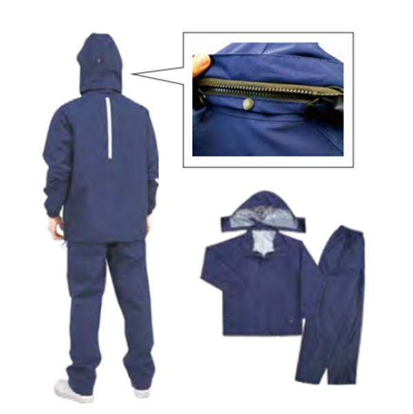 視界180度 回転フードシステム搭載の透湿防水レインスーツ。