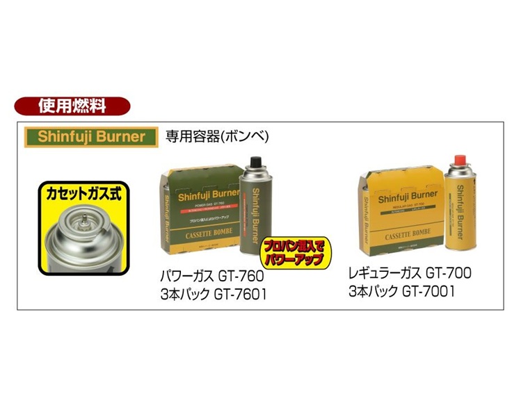 ●燃焼時間:約10分(GT-760 1本使用時) ●使用燃料:新富士バーナー製品専用容器(カセットガスタイプ)