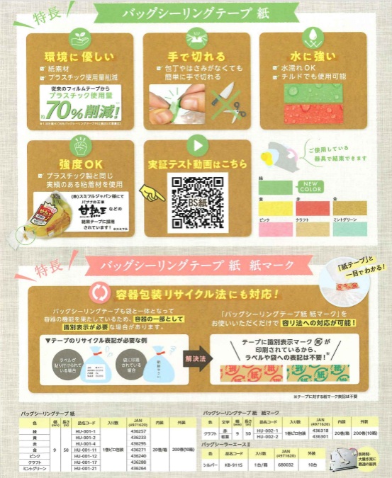 ・手で簡単に切れる紙素材のバッグシーリングテープ。