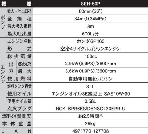 〇仕様:・吸入・吐出口径:50mm・全揚程:34m・最大吸入揚程:8m