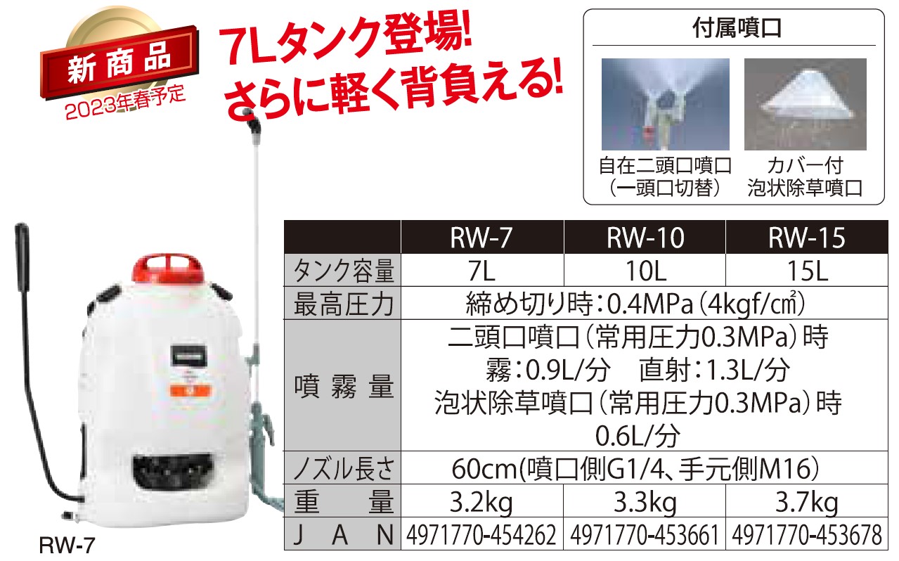 ・噴口:消毒用2頭口・泡状除草噴口 ・噴霧調整:霧・直射・泡状