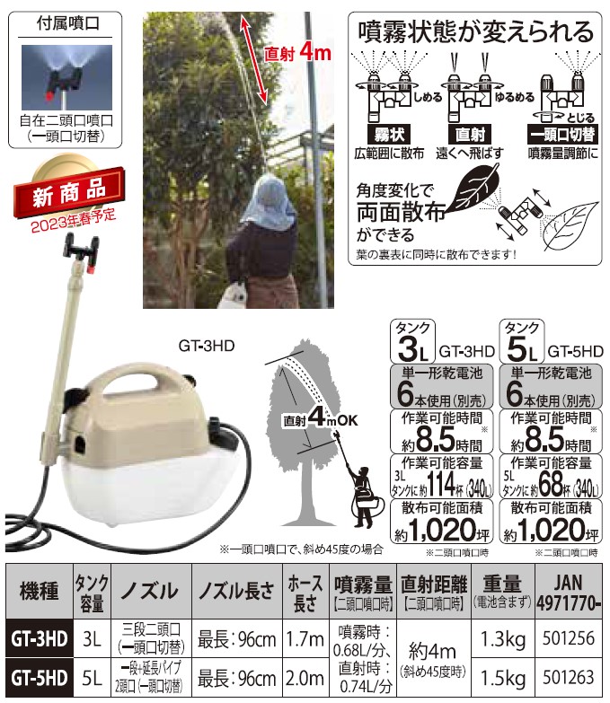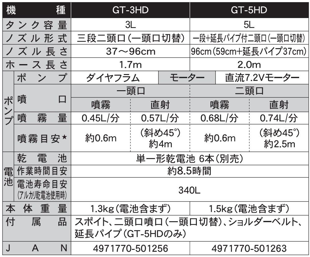 ・噴霧能力:450ml/分(一頭口)、680ml/分(二頭口)