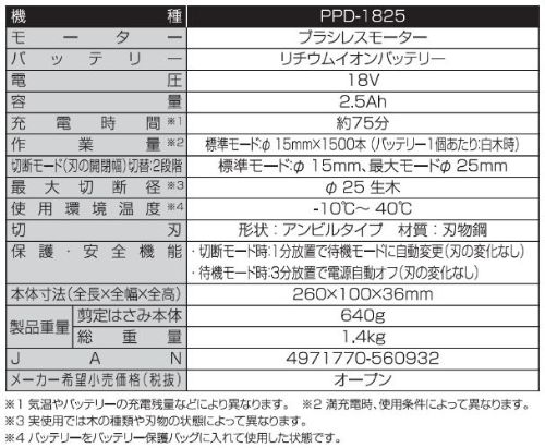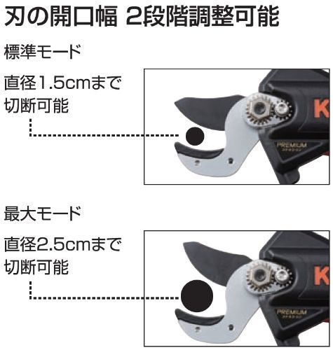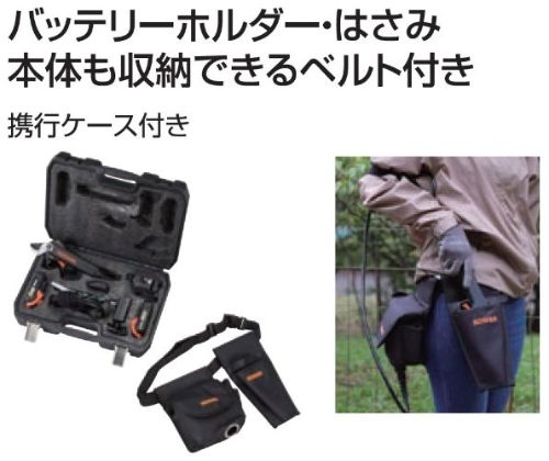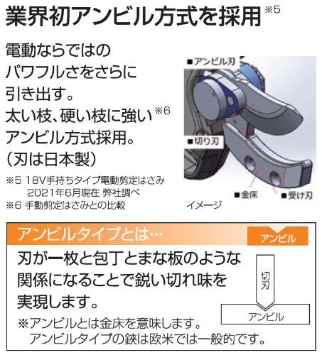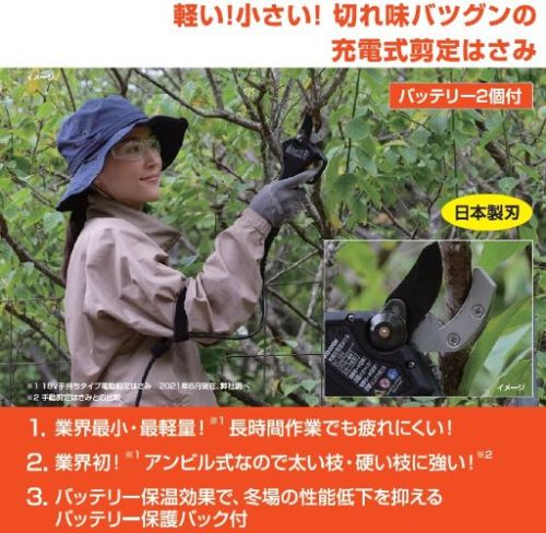 〇特長:電動式でラクにスパッと切れるプロにオススメの剪定はさみ小型、軽量で長時間作業でも疲れにくい!刃は日本製のアンビル式を採用、太い硬い枝に威力を発揮バッテリー保護バック付き、保温効果で冬場の性能低下を防ぎます。