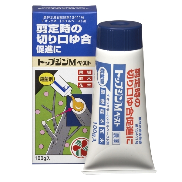 ペースト状の殺菌剤です。剪定、整枝時の切り口、胴枯病などの病患部を削り取った後の傷口に塗ることにより、病原菌の侵入を防ぎ、枯れ込みを防止し、切り口の治りを早めます。