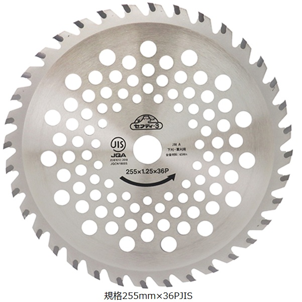 外径:255mm 刃数:36P 刃厚:2.0mm 台金厚:1.25mm 穴径:25.4mm 25cc以上刈払機推奨 JIS規格適合商品