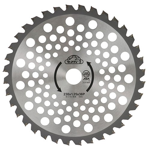 ●外径:230mm●刃数:36P●刃厚:2.0mm●台金厚:1.25mm●穴径:25.4mm●25cc未満刈払機推奨●JIS規格適合商品●台金材質:Mn65
