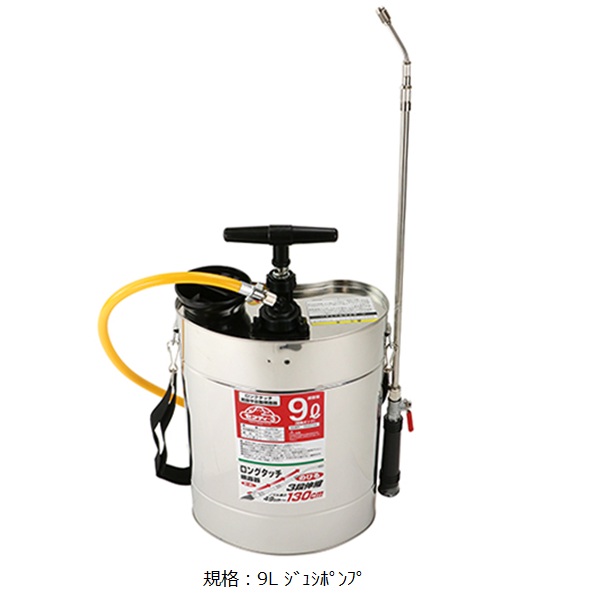 ●タンク容量:9L●樹脂ポンプ・重量:2050g●ノズル長さ:約49~130cm(伸縮式)●常用最高圧力:3kg/cm2●耐圧力:10kg/cm2●伸縮ノズル付●タンク:ステンレス