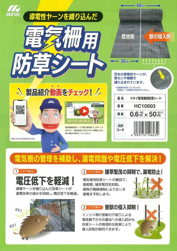 導電性ヤーンを織り込んだ電気柵用防草シートで電気柵の管理を補助し、