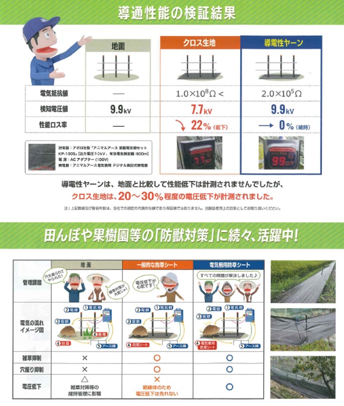 導電ヤーンを織り込んだ防草シートが通電効率の減少を抑制し、電圧低下を軽減。