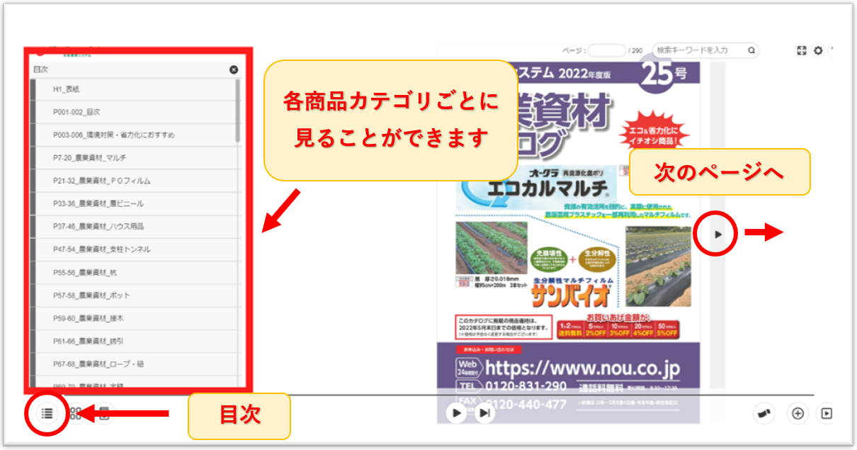 画面左の目次から各商品カテゴリを見ることができます。