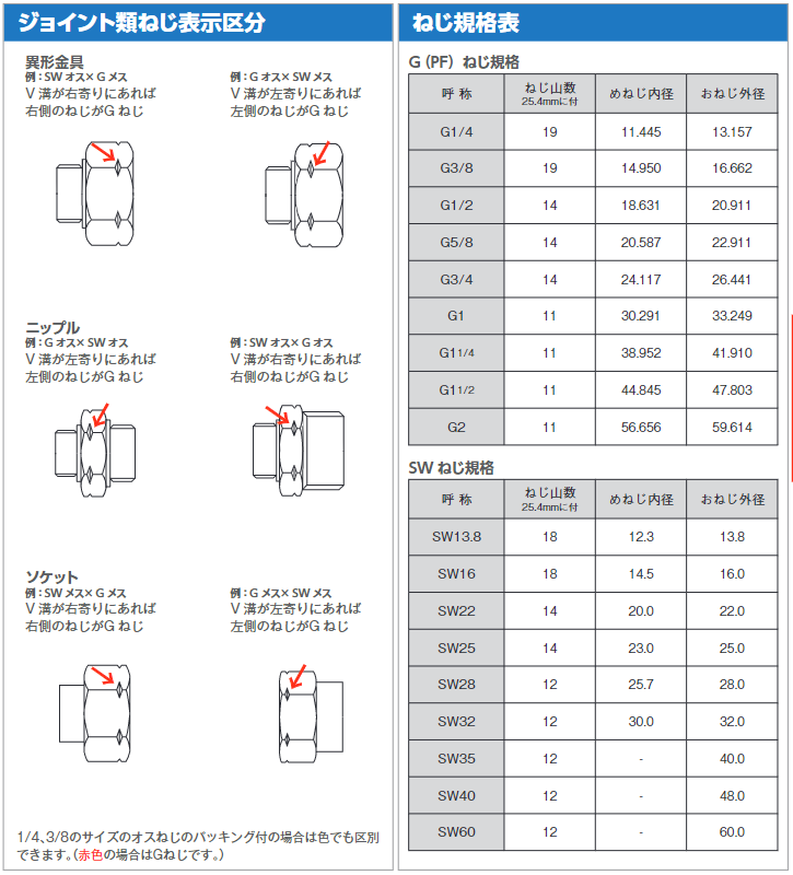 GネジとSWネジが混合しているジョイントの場合、溝がある側がGネジとなります。